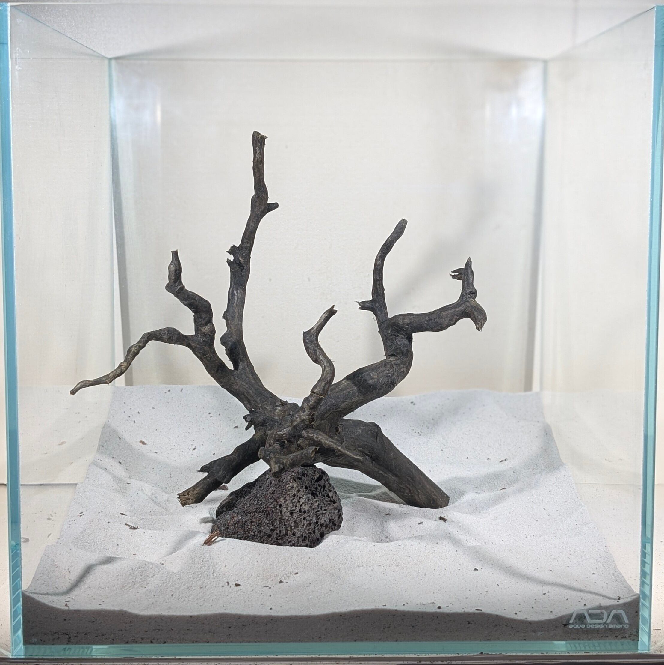長い沈水期間により自然な黒色を引き出したスマトラブランチウッド。植物とのコントラストが美しく映えます。