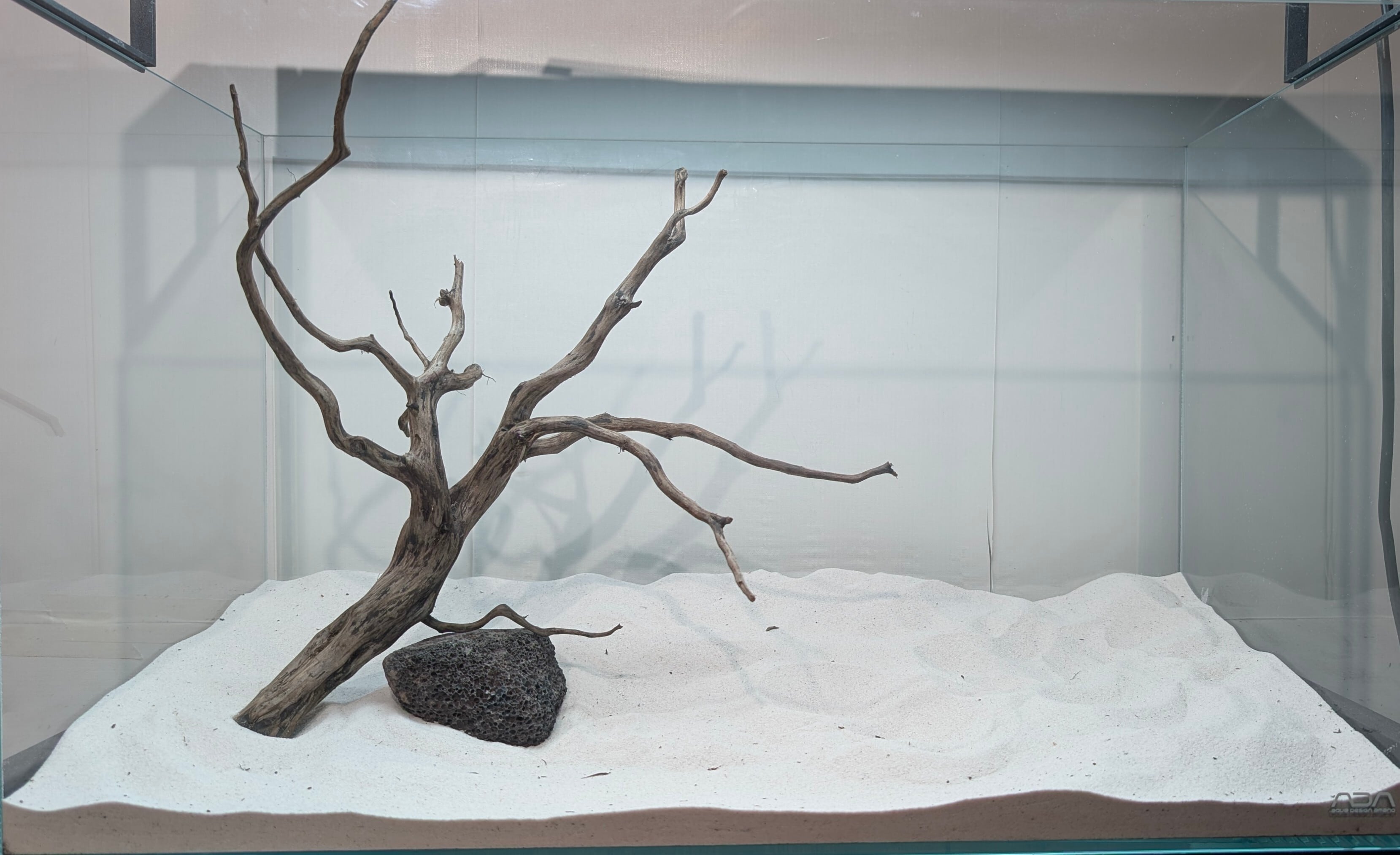 長い沈水期間により自然な黒色を引き出したスマトラブランチウッド。植物とのコントラストが美しく映えます。