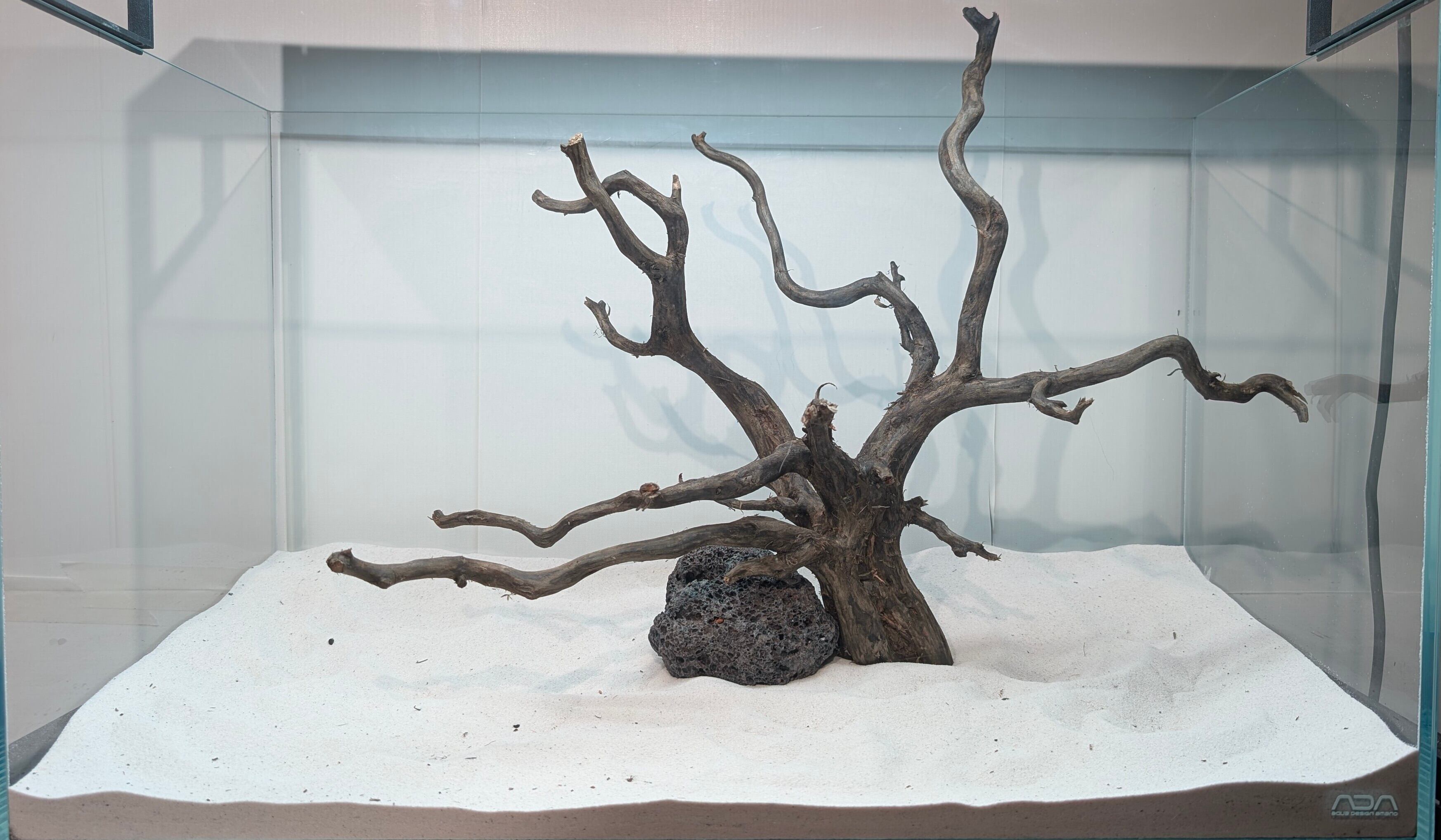 長い沈水期間により自然な黒色を引き出したスマトラブランチウッド。植物とのコントラストが美しく映えます。